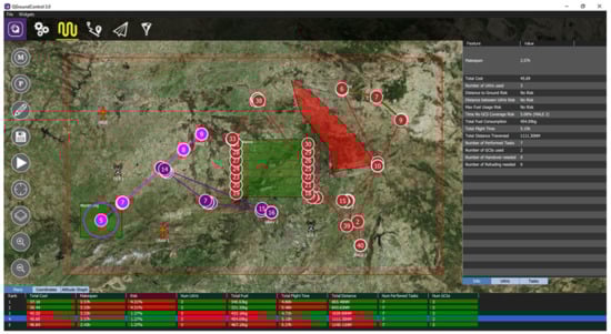 In this case, we consider a new mission, represented in Figure A13, with 3 UAVs, 1 GCSs, 1 NFZ and 6 objectives. As can be seen, the mission cannot be performed because the range of the GCS does not cover all the objectives of the mission.