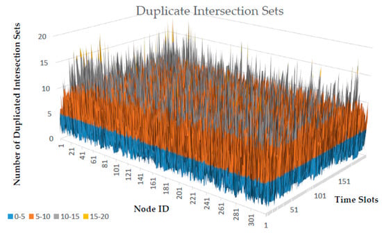 Duplicate Intersection Sets. The surface chart represents the example of duplicate intersection detected by each node for each time slot obtained from the simulation. The legend shows the range of duplicated intersection sets detected, defined by different colors. The results vary depending on the location and movements of each node during the simulation.