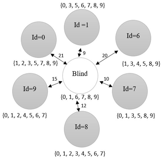 For example, Figure 3 shows the neighbor set of the blind node is {0, 1, 6, 7, 8, 9} and the neighbor set for node Id = 0 is {1, 2, 3, 5, 7, 8, 9}. The intersection set is the elements of the neighbor node’s neighbor set that intersects with the blind node’s neighbor set. Therefore, the intersection set of blind node and node Id = 0 is selected as {1, 7, 8, 9}. The complement set on the other hand is the elements of the neighbor node’s neighbor set that do not intersect with the blind node’s neighbor set, which result in the selection of {2, 3, 5}. Based on Figure 3, Table 5 is tabulated. Table 5 shows that the complement set of nodes 1 and 7 are duplicated. For this case, node 7 is removed as the distance of node 7 to the blind node is further than the distance of node 1 to the blind node. Later, node 9 is removed due to duplication of the intersection set with node 8 and it has a further distance to the blind node than node 8.