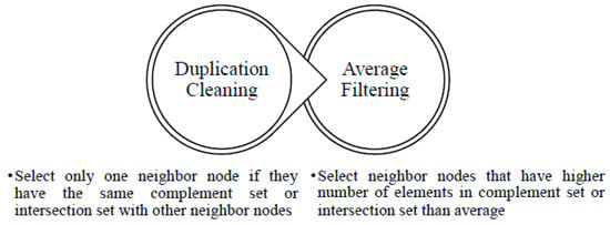 In this step, we compare the intersection and complement sets of each neighbor node with each other to find any duplication set. If the duplication set exists between the neighboring nodes, only the node with the shortest distance to the blind node is selected to avoid delay when connecting to far-away nodes. Therefore, less communication between the nodes is needed for the localization process when the duplicated data are ignored.