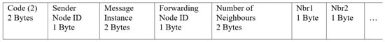 One communication unit (message exchange) is represented by one packet data. This packet data is transferred or received by each node. Therefore, each number of messages exchanged between nodes in Section 5.3 is represented in bit for the energy consumption calculation. The structure of the packet data for the neighbor information that was used to calculate the size of the message sent and received is shown in Figure 5. However, the equation used bit unit for the packet size, therefore, 1 Byte = 8 bits.