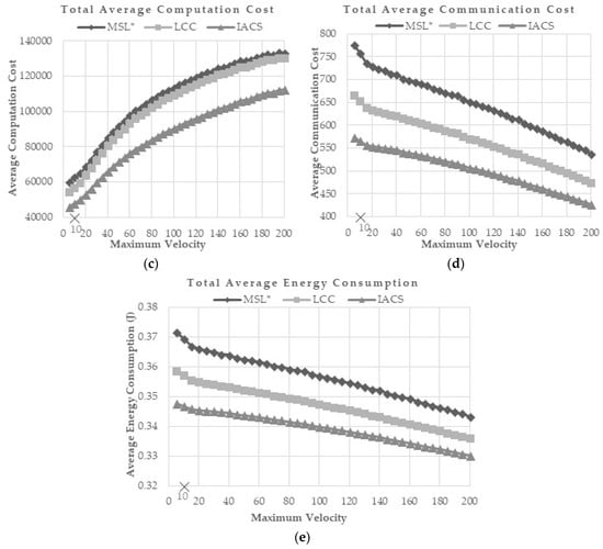 This evaluation is performed to observe how well IACS reacted under different maximum velocity compared with MSL* and LCC. To simulate a highly dynamic topology network, the modified random waypoint mobility model [] and zero pause time are implemented into each of the nodes. The nodes in the network are assumed to move during each time slot at velocity, v = 1/maxv, where maxv is the maximum velocity of the sensor nodes. maxv values tested are from 5–200 while the default speed used in MSL* and LCC is 10 (×marked). According to the results, sensor node velocity is directly proportional to estimation error and computation cost, while it is inversely proportional to communication cost and overall energy consumption. As the velocity of the sensor node increases, the network topology changing rate will be faster. Therefore, each node will lose connection with its neighbor in a short time. Figure 8a,b shows that the error estimation and closeness value are not much different for the three methods.