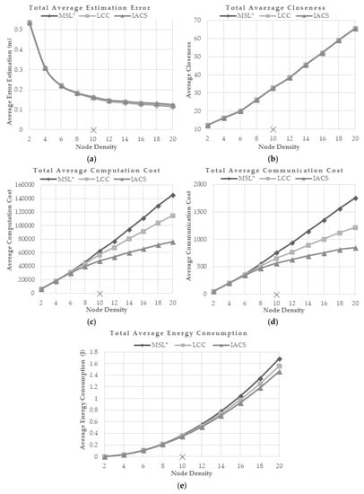 Node density represents the total density of nodes including both seed and normal nodes in the 500 × 500-unit area. A high node density represents a high number of sensor nodes in the environment that include both normal and seed nodes. The default node density parameter used is 10. This evaluation is performed to evaluate how well IACS with node density less and greater than 10. A density of 1 is equal to a total of 32 nodes. The seed nodes density tested for this evaluation is 1 in an environment of total nodes density ranging from 2 to 20. As the total number of nodes increases in the network, there will more nodes involved in the localization process that contribute to a better localization accuracy. However, this will increase the costs of the localization process. In that prospect, IACS provides the least costs of computation, communication and energy consumption compared to MSL* and LCC as the node density increases. IACS demonstrates a similar performance with MSL* and LCC in terms of average error estimation and closeness value wherein the average error estimation and closeness value increases with the increment of normal density (Figure 10a,b). For computation, communication and energy costs, the proposed IACS outperformed others by utilizing the least cost for different node density (Figure 10c,d).
