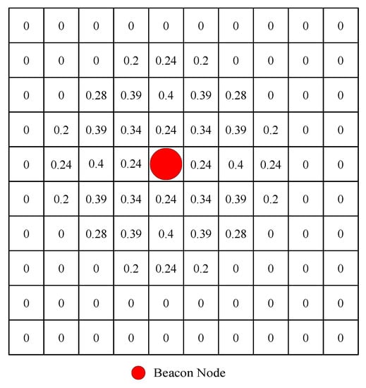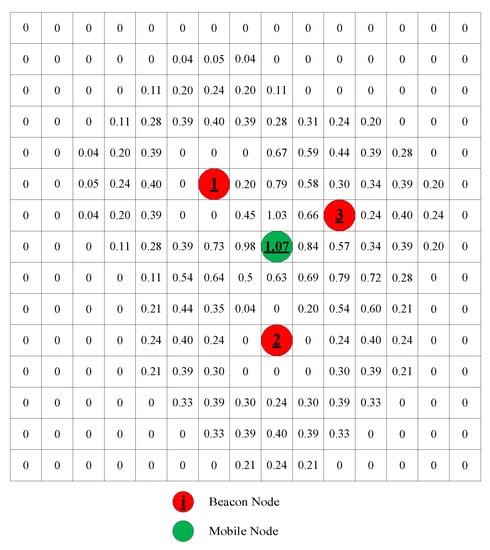 In Figure 2, it can be seen that the smaller the distance deviation is, the greater the probability. Figure 3 shows a 150 × 150 field with M = 15, w = 10 and = 1. The red dot indicates the location of the beacon node. The green dot indicates the final estimated position. The distance measured by the beacon nodes from the mobile node is 2, 3, and 2 respectively. The number on each grid represents the probability that the mobile node is at the grid. It can be seen that the smaller the distance deviation is, the greater the probability.