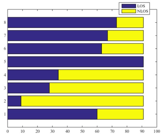For the localization methods based on WSN, the four main measurement methods to locate the mobile node consist of received signal strength (RSS) [], angle of arrival (AOA) [], time of arrival (TOA) [] or time difference of arrival (TDOA) []. If there is direct propagation, also known as line-of-sight (LOS), between the beacon nodes and the mobile node, we can obtain the accurate position of the mobile node through the filtering algorithms. However, one of the major challenges in wireless positioning technology is the non-line of sight (NLOS) problem [], which occurs when direct line-of-sight is blocked between the beacon and mobile nodes. In the case of NLOS, the propagation time of the signal is increased because the radio waves are reflected by the scatter or penetrate the blocking object []. Therefore, the WSN based localization in the complex NLOS environment is still a challenging problem.