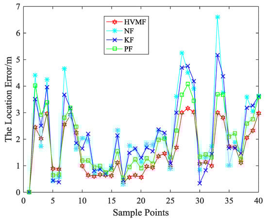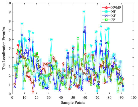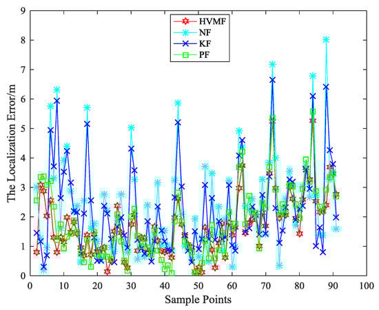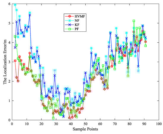 The localization error of each algorithm at each sampling site is as shown in Figure 21. The average localization errors of the NF, KF, PF, and HVMF algorithms are 2.3138 m, 2.2119 m, 1.9617 m, and 1.5684 m, respectively. Therefore the proposed method has better performance than the other methods.