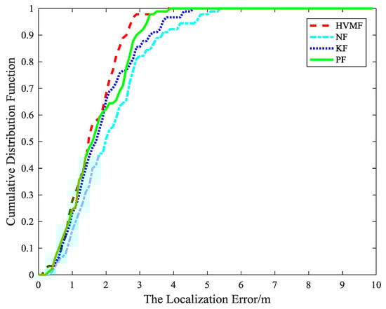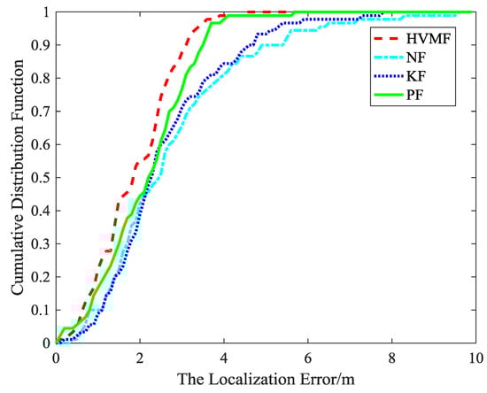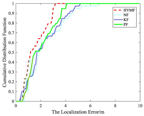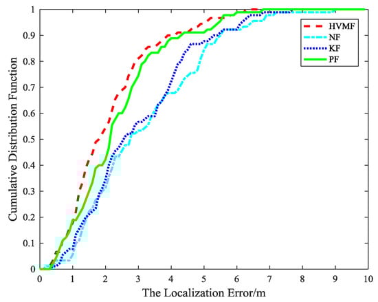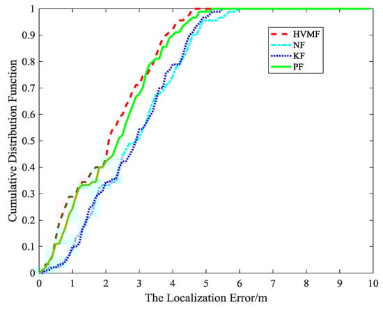 The cumulative distribution function of the localization error is shown in Figure 15. It indicates that the 90-percentile localization error of the HVMF algorithm is less than 3.5 m and the CDF tends to one at the localization error of less than 4.7 m. However, the 90-percentile average localization error of the KF, NF, and PF are already arrived at 4.3 m, 4.4 m, and 3.7 m, respectively.