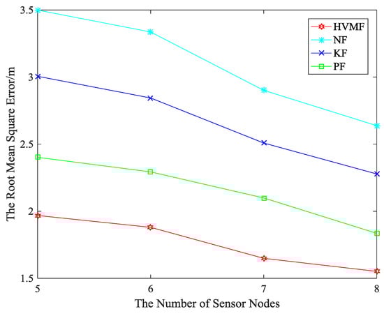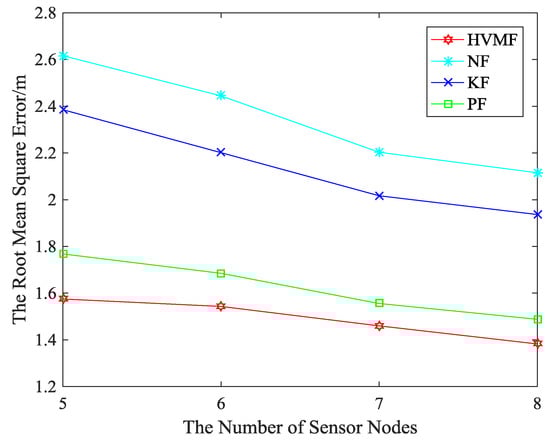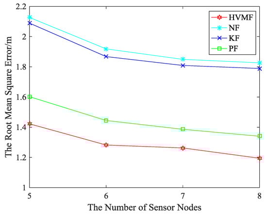 The relationship between the RMSE and the number of beacon nodes can be seen in Figure 17. The proposed method has higher localization accuracy than NF, KF and PF, about 36.45%, 30.20%, and 8.25%, respectively.