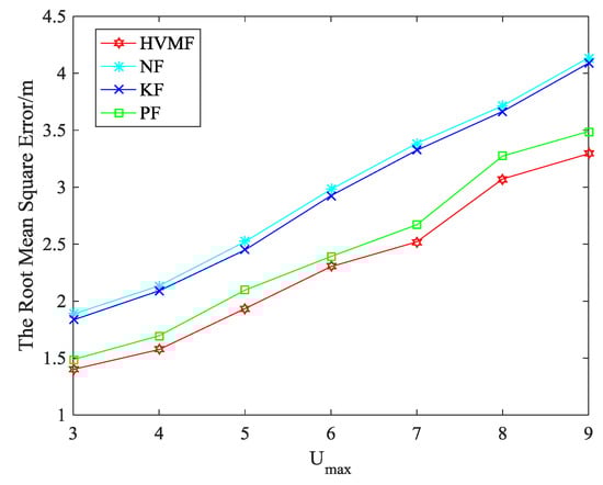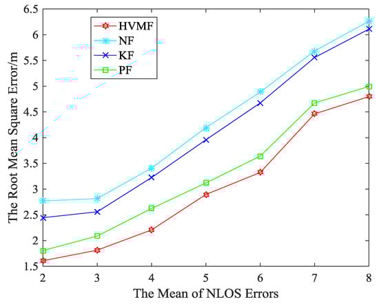 Figure 16 shows the effect of on the RMSE when the NLOS error obeys uniform distribution, i.e., . We can see that the RMSE of all methods increases with the increase of . The proposed method has the highest localization accuracy than KF, PF and NF, and the advantage of the proposed method becomes more and more obvious.