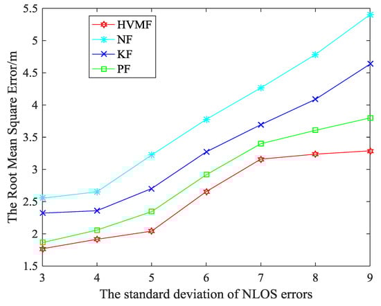 Figure 12 shows the effect of the standard deviation of NLOS errors on the RMSE. We can see that the RMSE of all methods increases with the standard deviation of NLOS errors increase. At the same time, the HVMF algorithm has better performance when the deviation is large. When the standard deviation of NLOS errors is 3, the proposed method has higher localization accuracy than NF, KF, and PF, about 30.72%, 23.82%, and 5.11%, respectively. When the standard deviation of NLOS errors is 9, the proposed method has higher localization accuracy than NF, KF, and PF, about 39.14%, 29.05%, and 13.43%, respectively.
