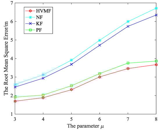 Figure 19 shows the performance of the proposed method when the NLOS error obeys the Exponential distribution. It can be observed that the RMSE increases with the parameter increases. The proposed HVMF method has the highest localization accuracy, but the NF method owns the worst performance. At the same time, the HVMF and PF algorithm have better performance when the deviation is large. When the standard deviation of NLOS errors is three, the HVMF method has higher localization accuracy than NF, KF, and PF, about 34.85%, 30.95% and 11.20%, respectively. When the standard deviation of NLOS errors is 8, the HVMF method has higher localization accuracy than NF, KF, and PF, about 45.35%, 42.17%, and 4.85%, respectively.