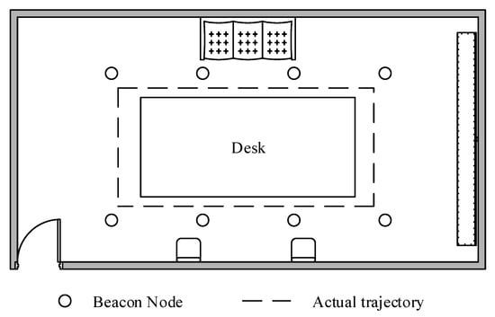 In order to test the localization performance of the proposed algorithm in a practical environment, we perform a realistic experiment in the building. The experimental equipment used for the experiment is a chirp spread spectrum (CSS) localization system, mainly consisting of CSS nodes. As shown in Figure 20, we deploy 8 beacon nodes in a 5 m × 7 m room. The beacon nodes and unknown nodes and are installed up to 1.7 m above the ground. MN moves around a rectangle table at a constant velocity. The distance measurement frequency of the CSS nodes is set to 20 Hz, and 20 distance measurements are carried out at each sampling site in order to weaken the negative impacts imposed to the localization accuracy. The average measurements at each sampling site are used for the localization calculation.
