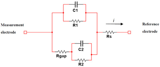 where and represent the contribution of the empty microelectrodes to the electrical response of the cell culture, and and depict the electrodes covered by cells. On the other hand, models the resistance that the current must overtake to arrive at reference electrode. Finally, represents the equivalent resistance that models the separation zone or interface region between the cell and the electrode.