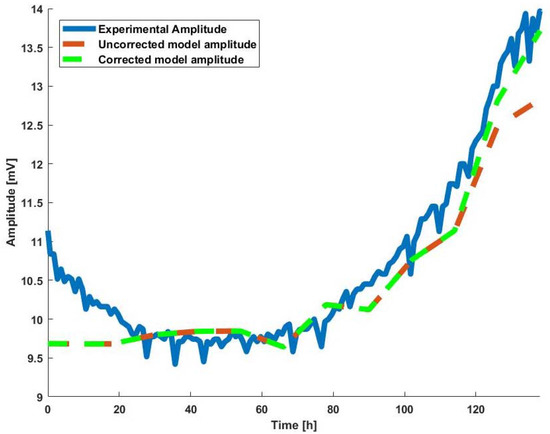 Finally, Figure 2 shows the experimental amplitude evolution (blue) and the evolution of the oscillation amplitude of the fitting model without correction (red). As can be seen, there is a certain error, and by applying the correction to , it is possible to reduce the error almost completely (green).