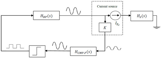 Equations (12)–(15) are the functions which describe the OBT approach (Figure 3). Equation (12) is the transfer function of the required band-pass filter, whose natural frequency is and Q it is its quality factor. Equation (13) is the transfer function of a filter, composed of a low pass filter and a high pass filter, whose natural frequencies are and , respectively, and and are their respective quality factors. On the other hand, in Equation (14), is the linearized transfer function of the comparator obtained from the Describing Function method [20]. In this equation, is the reference voltage of the comparator, aosc is the oscillation amplitude of the input signal of the comparator, and h is a parameter that depends on the hysteresis of the comparator (which is configured through a feedback of passive components). Finally, HZ.CS(s) is the transfer function of the current source to which the BioZ is connected as a load. The transfer function of BioZ is multiplied by a constant that depends on the resistances of the current source.