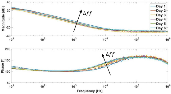 Both the system equations (OBT) and the equations of BioZ electric model ((6) and (16), respectively) were used to obtain and . The position of the zero of the BioZ model was fixed at 15 kHz for all experiments, since it was verified by means of the analysis of the Bode diagram of the cell-electrode system (in several experiments) that was always located at this frequency, as can be seen in Figure 4 (areas of the Bode diagram of the frequencies of interest in our system are shown in Figure A6). From the frequency and amplitude of oscillations at the beginning of the experiment (), it is known that the value of has an almost null influence at this point of the experiment and considering that by definition in Equation (5) is 0, and and can be obtained for the calibration experiment. After that, and are achieved using the oscillation amplitude and frequency when , which are the same in each cell line.