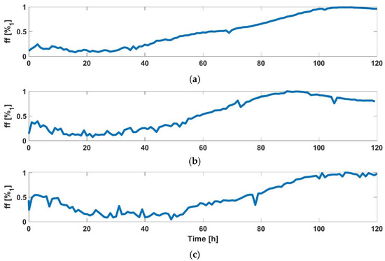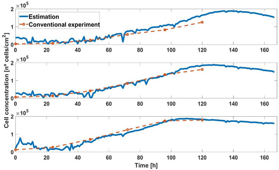 Some simulations of real time experiments were carried out, as was explained in the previous paragraph. These simulations were made using experiment data with different initial cell densities to corroborate the method. Even so, there is an ff estimation error that was adjusted at the end of the experiment. Error correction was done to estimate the error and validate this technique. ff is corrected using Equation (18).