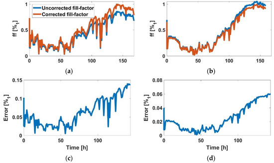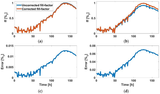 (a) Comparison between uncorrected and corrected ff, and (b) ff estimation error (AA8 with 2500 cells at the beginning). (c) Comparison between uncorrected and corrected ff, and (d) ff estimation error (AA8 with 5000 cells at the beginning).