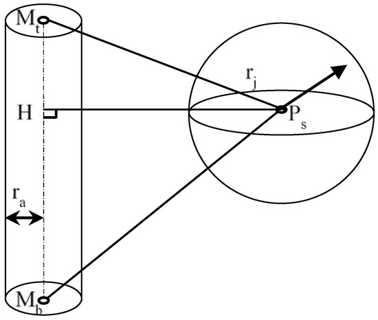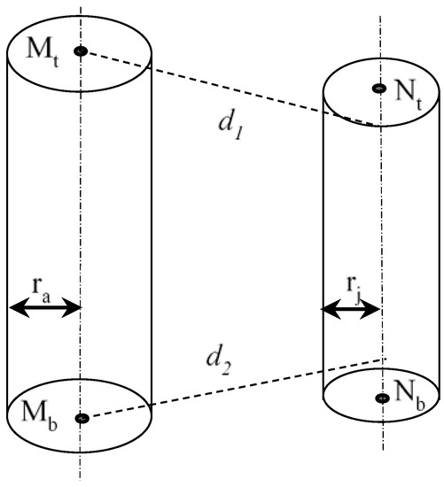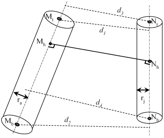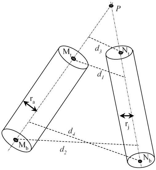 - If one of the two intersections, Mh or Nh, do not lie on the segment, i.e., or , the shortest distance is the smallest among , and d1, d2, d3 and d4, as shown in Figure 4. d1, d2, d3 and d4 are the perpendicular distance from point Mt to , the perpendicular distance from point Mb to , the perpendicular distance from point Nt to, and the perpendicular distance from point Nb to , respectively.