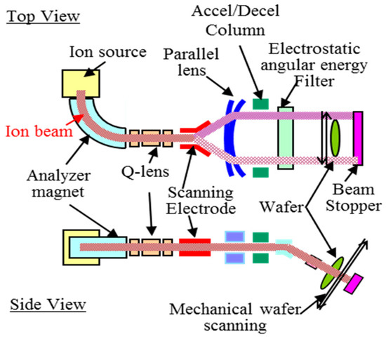 In order to explain a typical ion implanter’s structure, top view and side view block diagrams for medium-current machine, NV-MC3-II of SMIT (Sumitomo Heavy Industries Ion Technology Co., Ltd., Tokyo, Japan), are shown in Figure 2 [14]. Ions are generated from a gas or solid source material at the ion source arc block. The generated ions are extracted by the extraction electrode, to which extraction voltage is applied, and delivered to the analyzer magnet. The analyzer magnet selects ions having a desired bending radius in the magnet, Rb, which is given as: