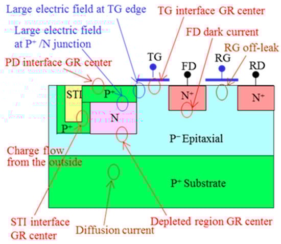 Various possible causes of dark current generation, illustrated in CMOS image sensor pixel cross-section. PD: photodiode; TG: transfer gate; FD: floating diffusion; RG: reset gate; RD: reset drain; GR center: generation recombination center; STI: shallow trench isolation.