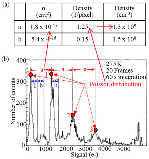 Figure 4 is a dark current histogram of a virtual phase CCD (Charge-Coupled Devices), which has rather many blemishes [14]. It has two series of specific and periodic peaks, labeled as “a” and “b”. Four peaks for the series “a” are seen, and they denote 0 to 3 metal atoms at a pixel from the left to the right peak. Assuming each metal is distributed as Poisson distribution, each metal’s density per pixel is derived by fitting. If the depletion region volume is estimated by the device simulation, metal density per volume can be calculated. The σ is derived from the peak pitch using Equation (4). The obtained metal densities and σ’s are shown in the inset table. The metal is identified from its cross-section. This method is called dark current spectroscopy [16]. As explained above, image sensors are so sensitive to metal contamination that even one metal atom can cause a blemish and can be detected by image sensors.