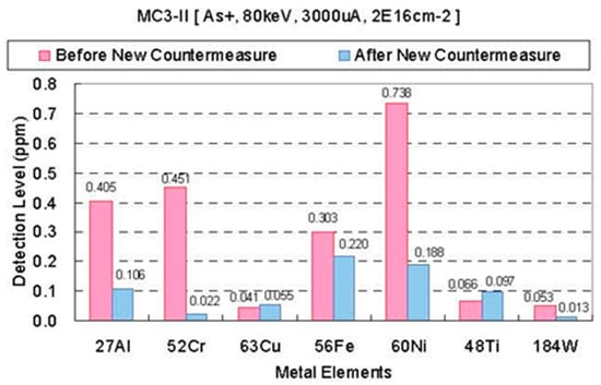 Metal contamination measurement by inductively coupled plasma mass spectrometry (ICPMS) [17]. Red denotes the metal contamination before the new countermeasure, and blue denotes that after the new countermeasure, in a MC3-II of SMIT.