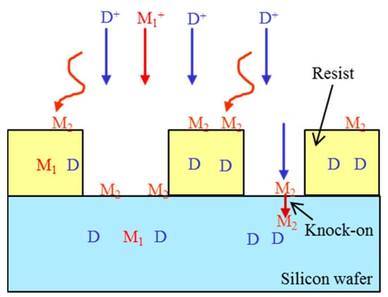 Cross-sectional illustration showing ion implantation process and metal contaminations. Straight line arrows denote energetic ion implantation, and wiggle line arrows denotes physisorption. D: dopant, M1: metal, which is implanted, M2: metal, which is physisorbed.