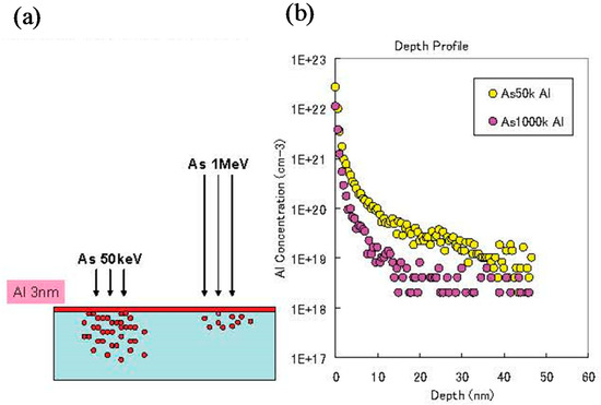 Although most of the physisorbed metals are washed out by a following cleaning process, some of them invade the silicon by thermal diffusion or knock-on. To learn about the knock-on effect, Figure 7 shows the knocked-on aluminum depth profiles by Monte Carlo simulation [17]. The condition is that after a 3 nm thick aluminum layer is deposited on the silicon wafer, 1 × 1015 cm−2 As with two different energies, 50 keV and 1 MeV, is implanted. The aluminum layer emulates physisorbed metals. The aluminum depth profile becomes larger and deeper if the implantation energy is smaller. While the knocked-on aluminum atoms reach 15 nm deep in silicon by 1 MeV, they reach 45 nm deep in silicon by 50 keV. It is notable that if the ion energy is smaller, the knock-on effect becomes larger because the cross section becomes larger according to the Rutherford scattering formula.