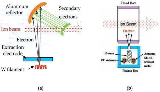 One is an ion beam neutralizer, which is applied to suppress the charge up. In the early stage, an electron shower was used, which generates primary electrons by hot tungsten filament and accelerated electrons hit on an aluminum reflector to generate secondary electrons. These secondary electrons neutralize the ion beam and the wafer surface, as shown in Figure 8a. Its drawbacks are metal contamination from the tungsten filament and rather high energy of the secondary electrons for neutralization. To eliminate these drawbacks, a plasma shower was developed and has been used. As illustrated in Figure 8b [17], plasma is generated by a hot filament or radio frequency (RF) antenna in plasma box, and electrons are extracted to the flood box. Then, they neutralize the ion beam and wafer surface. Because plasma is used, the energy of the extracted electrons is small, which is good for neutralization. When RF antenna, coated with non-metal dielectric material, is used, metal contamination is greatly reduced.