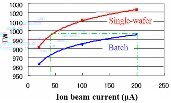 First, damage is compared between the single-wafer type, MC3 of SMIT, and the batch type, GSD-HE of SMIT, in Figure 9. To measure damage, therma wave (Therma-Wave, Inc., Fremont, CA, USA) is used, which has positive relation with the damage. The implantation condition is P+, 90 keV, 2 × 1013 cm−2. In GSD-HE, 13 × 200-mm-wafers are loaded at once. Both of the single-wafer type and the batch type have larger TW value or larger damage when the beam current increases in a range from 20 to 200 µA. This is reasonable result. The single-wafer type has larger TW value compared with the batch type. The TW value of the single-wafer type at 40 µA is equal to that of the batch type at 200 µA. It might be said that batch type has effectively 1/5 of the ion beam current of the single-wafer type from a damage viewpoint.