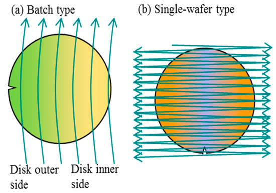 Damage distribution illustrations [17]. Arrows denote beam scans. (a) Batch type: the damage is smaller and more uniform. The damage at the disk inner side is slightly larger; (b) single-wafer type: the damage at the left side and the right side is largest.