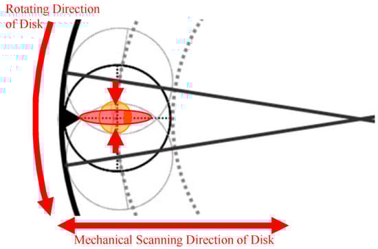 Configuration of the disk, the wafer and the beam spots [23]. Two kinds of beam spot shapes are prepared; Round shape: reference; Oval shape: to shorten the beam irradiation time.