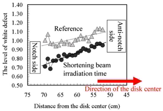 This damage non-uniformity at the batch type is explained using another experimental result in Figure 11 and Figure 12 [23]. Figure 11 shows the configuration of the disk, the wafer and the beam spots. The distances from the disk center are 71 cm at the disk outer side, 61 cm at the wafer center, and 51 cm at the disk inner side. Since the disk spinning speed is 815 rpm, the beam moving speeds on the wafer are 6.1 cm/ms at the disk outer side, 5.2 cm/ms at the wafer center, and 4.4 cm/ms at the disk inner side. Therefore, the beam moving speed at the disk inner side is 1.4 times slower than that at the disk outer side. Two kinds of beam spot shapes are prepared; one is a conventional round shape and the other is an oval shape, which shortens the beam irradiation time. Figure 13 shows the level of white defects in a CCD image sensor. The horizontal axis is the position from the disk center. The disk inner side is located at the right-hand side. The vertical axis is the relative level of white defects. This result clearly shows that the damage at the disk inner side is larger, and the damage of the oval beam shape is smaller. Another experimental result is shown in Figure 13, which is the disk spinning speed dependence on the damage layer thickness. Although an amorphous layer was not generated by this experiment, a damage layer with different optical index was observed by a spectroscopic ellipsometer. As shown in Figure 13, the damage layer is thinner, when the disk spinning speed is larger. Even if the damage becomes smaller, the disk spinning speed cannot be increased because the resist pattern breakage by particles might become more frequent. The results, as shown in Figure 9, Figure 10, Figure 11, Figure 12 and Figure 13, suggest that even if the dose amounts and beam currents are the same, shorter irradiation time case shows smaller damage.