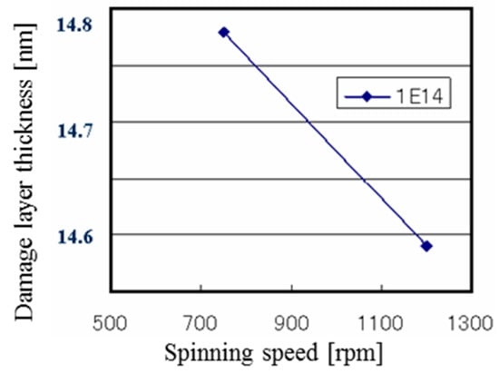 Damage layer thickness dependence on disk spinning speed [22]. Batch type: GSD-HE (SMIT); Ion: BF2; Energy: 20 keV; Dose: 1 × 1014 cm−2. Although amorphous layer was not generated by this experiment, a damage layer with different optical index was observed by a spectroscopic ellipsometer. The damage layer thickness indicates thickness of the damage layer.