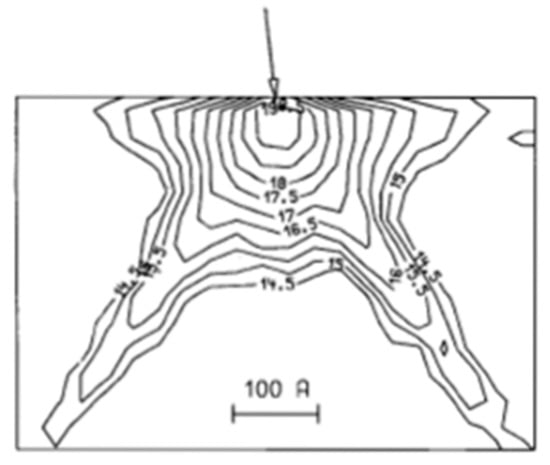Because image sensors have low noise, even small irregularities are not allowed. One of the important problems is image lag in the PPD [24]. Not even a single electron should remain in the PD after the transfer period. Therefore, in order to achieve no image lag, precise design and process technology should be applied to form PPD pixels. As explained in Section 2, ion implantation can afford precise dose, depth and doping area. However, it has a large limitation, i.e., channeling. Figure 14 shows the boron concentration profile by Monte Carlo simulation as an extreme example [25]. The arrow denotes the point, where B+ ions are implanted with the conditions; (100) silicon wafer, 0.5 keV energy, 1 × 1015 cm−2 dose, and 7° tilt, 22° twist. This combination of angles is regarded as a small channeling condition. However, because ion energy is so small and channeling becomes so large the profile is very different from those obtained by usual amorphous model simulation. Notable fingers are formed in <110> direction due to de-channeling. Channeling brings a deeper dopant profile, which causes lower sheet resistance. It also wreaks undesirable dopant distribution dependence on channeling direction, sheet resistivity non-uniformity on a wafer, lot-to-lot sheet resistivity variation. Moreover, it might bring unexpected electric field concentrations at the fingertips. In this section, channeling will be discussed.