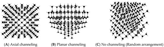 Figure 15 illustrates the different appearance of the crystal lattice by the view angle. There are pipe-like spaces (channels) in (A) and sheet-like spaces in (B), while there are no spaces in (C), which looks like a random arrangement. If ions fly through these spaces with little collisions, it is called channeling. There are two kinds of channeling: axial channeling (A) and planar channeling (B).