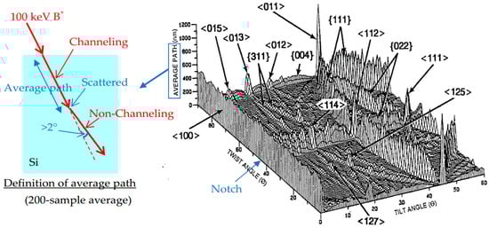 The channeling depends on the silicon surface orientation, the ion beam angle, energy, ion species, substrate temperature, etc. Figure 16 shows the average path dependence on the tilt and twist angles by Monte Carlo simulation [27,28,29]. The mean path is defined as the distance along the ion trajectory until its direction deviates by more than 2° from the initial incident direction. The average path is an average over 200 simulated paths. It can be considered as a channeling measure. The notch is located at twist =45°. The mountain ranges indicate the planer channeling, and the independent peaks are the axial channeling. There are so many axial and planer channeling directions. Among them, <011> axial is the largest. Other prominent axial channels are <112>, <100>, <111>, <013>, and <114>. Planar channels are apparent for {111}, {022}, {311}, and {004}. The preferable tilt and twist combinations to reduce channeling can be chosen by using Figure 16. If the appropriate ion implantation direction has some angle to TG to suppress the channeling, for example, multi-step implantation should be applied to keep the symmetry.