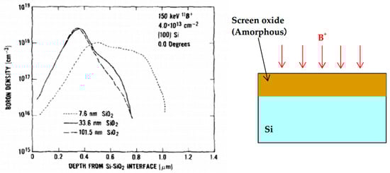 Boron density profile with various screen oxide thickness [30]. Wafer: (100) Silicon, Ion: 11B+, Energy: 150 keV, Dose: 4 × 1013 cm−2, Tilt: 0.0 ± 0.1°.