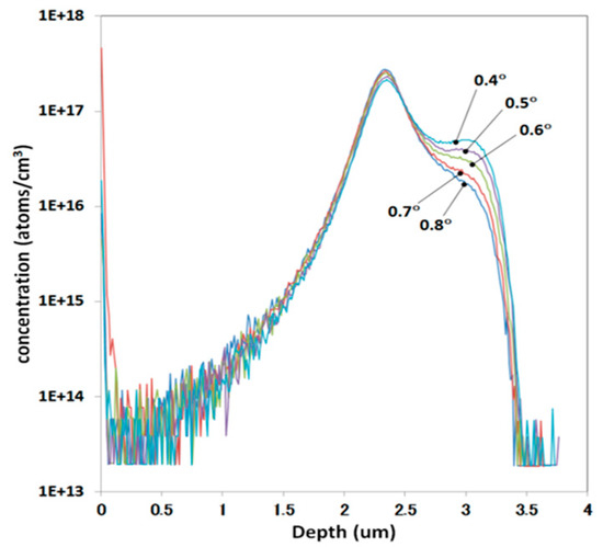 Lastly, discussion is focused on zero-degree tilt implantation, which is applied to avoid shadowing occurring due to resist patterns and to obtain deeper profiles by intentional channeling. Figure 19 shows the SIMS profiles implanted with 0.4–0.8° tilts in 0.1° steps, 1.5 MeV energy, 1 × 1013 cm−2 dose of B+ [31]. There are clear differences in the SIMS profile even only 0.1° tilt steps due to the channeling differences. Because wafers usually have a small-angle off-angle to obtain good quality epitaxial growth, and the wafer orientation and implanter angle setting contain errors, it is difficult to control channeling at present. Therefore, it can be said that the zero-degree tilt implantation is quite a variable process.