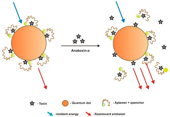 Schematic of the design strategy for the optical fluorescent resonance energy transfer (FRET) competitive binding assay developed by Jackson et al. [61], to detect anatoxin-a (ATX-A), based on quantum dot nanocrystals with ATX-A bound on their surface, and aptamers to ATX-A conjugated with quenchers of QDs fluorescence.