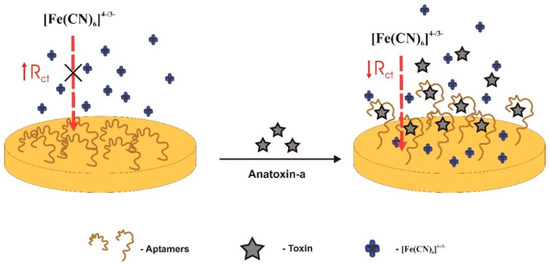 To produce an impedance aptasensor for ATX-A detection, Elshafey et al. [31] used a monolayer of aptamers self-assembled on a gold electrode (Figure 2). Aptamers were disulfide modified [HO−(CH2)6S−S−(CH2)6−DNA]). The self-assembled monolayer (SAM) was modified by mercaptohexanol (a short alkanethiol) to displace those aptamers weakly adsorbed from the gold surface, and backfill, leaving only aptamers that were covalently bound via their thiol moieties. Aptamer binding was monitored through the [Fe(CN)6]4−/3− standard redox probe. In the absence of ATX-A, the negatively-charged redox probe was repelled from the electrode’s surface and its redox reaction is hampered, thereby increasing the resistance to charge-transfer on the gold support. Upon ATX-A recognition, aptamers switched into more compact structures, enabling the contact of the redox probe to the surface, thereby decreasing the resistance to electron transfer, which was used as the sensor signal. The sensor showed a LOD of 0.5 nM, below the guideline value of 1 μg/L for water safety [72]. The linear range of detection (LRD) was between 1 nM and 100 nM, with a dissociation constant, Kd, of 27.14 ± 75.38 nM.