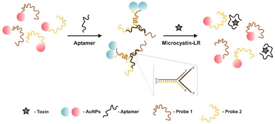 In the presence of the aptamer, the two DNA probes and the aptamer form a Y-shaped DNA duplex, which maintains DNA probes linked and gold nanoparticles (AuNPs) near, forming a dimer [58]. When microcystin-LR is added, the aptamers leave the DNA probes and link to the toxin, changing the structure. The pre-formed AuNP dimers disassemble to monomers and, solution color changing from blue to red.