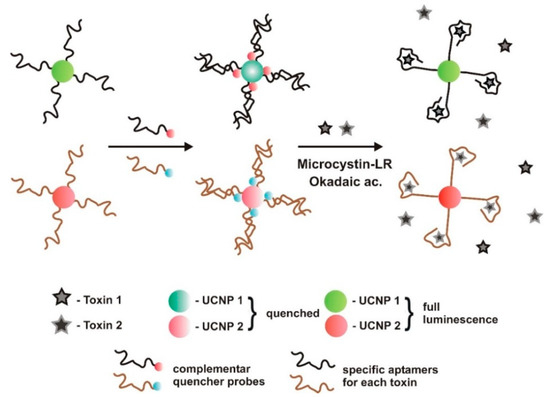 A dual FRET aptasensor was developed by Wu et al. [59] to monitor simultaneously MC-LR and OA, employing green and red upconversion nanoparticles (UCNP) luminescence as the donors, and two quenchers as the acceptors (Figure 4). Lanthanide-doped near-infrared (NIR)-to-visible UCNPs can emit strong visible luminescence with the excitation light typically at 980 nm [82]. Biotinylated aptamers against each toxin were conjugated to different UCNPs. NaYF4: Yb, Ho UCNPs were linked with aptamers against MC-LR and NaYF4: Yb, Er/Mn UCNPs with aptamers against OA. UCNPs have many advantages over other organic fluorophores due to their optical and chemical features, such as tunability, the absence of auto-fluorescence, and the light-scattering background that can be induced by samples. Multicolor UCNP can be used to build multiplex biosensors for the detection of various analytes simultaneously [83]. The two donor-acceptor pairs were produced by hybridizing the aptamers with their complementary DNA. The upconversion luminescence was quenched by quenchers (BHQ1 and BHQ3 from SIGMA, St. Louis, MO, USA) of high overlapping spectrum, attached to oligonucleotide probes (AATGAGGTGGTATGGGTAATTGTCATGGTGGTCCTGTTTG-BHQ3 for MC-LR and TCGTCACATTGACCCTTCGCGTAGCGCTCCCTGTTGTTGG-BHQ1 for OA). When analytes are added, the corresponding aptamers de-hybridize from the complementary DNA to bind to them, preventing the quenching of green and red luminescence. The relative luminescence intensity increased proportionally with increasing toxins concentration, allowing their quantification. The LODs for MC-LR and OA were 0.025 and 0.05 μg/L, respectively. The LRD concentration ranged from 0.1 to 50 μg/L for both toxins. Good recovery and repeatability rates (RSD) were found, 6.47% for MC-LR and 6.24% for OA. This dual FRET assay is robust to interference and has excellent specificity, as tested with DTX-1 and DTX-2 for OA aptamer, and MC-LA and MC-YR for MR-LR aptamer.