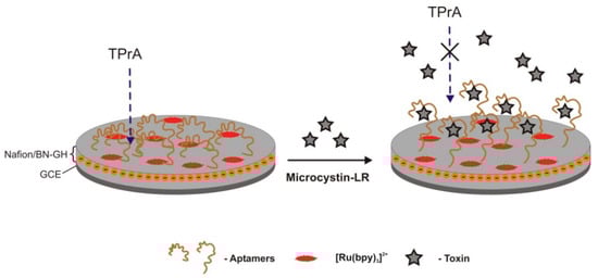 The same research group [34], has changed the detection methodology of the aptasensor developed previously [32], to validate the effect of the aptamer-MC-LR assembled to a quartz crystal microbalance (QCM); the 2D graphene layer was replaced by a three-dimensional (3D) graphene hydrogel, co-doped with boron and nitrogen (BN-GH), self-assembled on a tris(2,2′-bipyridine)ruthenium (II)-luminophore immobilization platform, to increase aptamers loading due to the nanoporous structure and large specific surface area of the new sensor. Three-D graphene hydrogels (GHs) can supply multidimensional electron transport pathways and be very suitable to assemble more electrochemiluminescent (ECL) molecules on its surface for enhancing its ECL intensity [86,87]. The sensor is a “signal-off” switch system to the Ru(bpy)32+−TPrA (tripropylamide) (Figure 5). When MC-LR was incubated with the aptamers, the ECL signals detected by an electrochemiluminescence analyzer decayed intensely as the toxin/aptamer couples blocked the approaching of the coreactant TPrA to the Ru(bpy)32+ on the electrode interface. This novel ECL biosensor displayed high sensitivity and selectivity, with a LOD of 0.03 pM and a LRD ranging from 0.1 to 1000 pM.