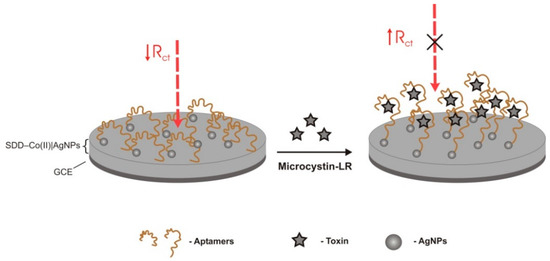 Electrochemical aptasensor for microcystin-LR (MC-LR) detection using a glassy carbon electrode (GCE) with aptamers self-assembled on a surface of cobalt (II) salicylaldimine metallodendrimer (SDD–Co(II)) doped with silver nanoparticles (AgNPs), by their 5′ thiolated end [38]. When aptamer-MC-LR complexes are formed, there is a decrease in the peak current. Rct—charge transfer resistance.