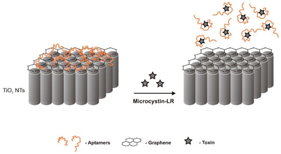 Label-free visible-light driven photoelectrochemical aptasensor for microcystin-LR (MC-LR) detection [52]. Aptamers are conjugated onto vertically aligned titanium dioxide nanotubes (TiO2 NTs) photoanode substrate, functionalized with graphene, where the DNA nucleobases are adsorbed via π-π staking. In the contact of MC-LR, aptamers leave graphene sheets and lead to the increased photocurrent.