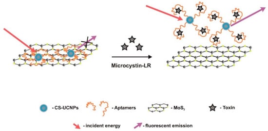 Optical aptasensor that uses the higher fluorescence of lanthanide ions doped core/shell upconversion nanoparticles (CS-UCNPs) and MoS2 nanosheets [53]. In the presence of microcystin-LR, aptamers combined preferentially with MC-LR, changing conformation, detaching from MoS2 and recovering fluorescence.