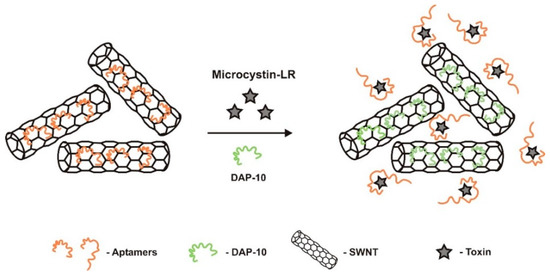 A novel ultrasensitive fluorescent aptasensor was developed by Taghdisi et al. [35] (Figure 10) for detection of MC-LR, using single-walled carbon nanotubes (SWNTs), dapoxyl dye and an aptamer (DAP-10) with affinity to dapoxyl dye. SWNTs were used to immobilize DAP-10 (5′-CAATTACGGGGGAGGGTGTGTGGTCTTGCTTGGTTCGTATTG-3′) and an unmodified MC-LR aptamer (Apt) that was used as a sensing ligand. Significantly different fluorescence intensity was measured in the presence and absence MC-LR. Without MC-LR, DAP-10 could not adsorb to the surface of SWNTs because it was loaded with Apt and no space was available. After adding dapoxyl to the supernatant and have the sample centrifuged, it becomes strongly fluorescent. When dapoxyl is attached to DAP-10 its fluorescence increases significantly because the surrounding gets less polar as compared to water. When the Apt binds to MC-LR it leaves free space on SWNTs surface for DAP-10 aptamer to attach, resulting in very weak fluorescence intensity of the sample after addition of dapoxyl. Apt was used without any modification, which increased the sensitivity of the sensor. The LOD was 138 pM (0.137 μg/L) and the LRD was from 0.4 to 1200 nM.