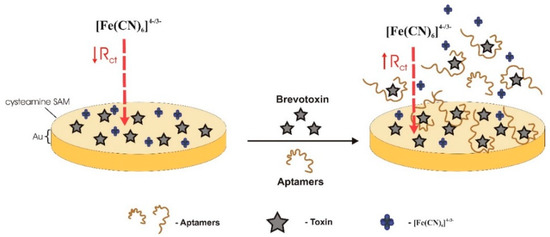 Label-free impedimetric competitive biosensor for brevetoxin-2 (BTX-2), developed by Eissa et al. [37], where competition is established between the BTX-2 immobilized on the self-assembled monolayer (SAM) of cysteamine on a gold electrode surface, and the free BTX-2 in solution, at a specific aptamer concentration. The change of charge transfer resistance (Rct) of the [Fe(CN)6]4−/3− redox couple is the signal for electrochemical detection.